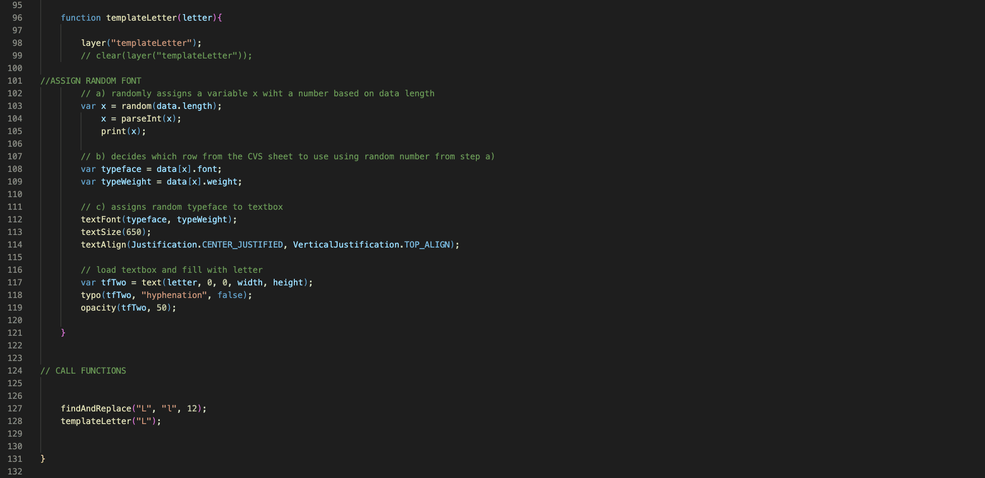 Through working on this typeface and creating a code for artistic exploration, I began appreciating the beauty that emerges when technology and creativity converge in the design process. Iām currently further developing this project by embracing the generative system to build designs that resonate with others both in and out of the design space.